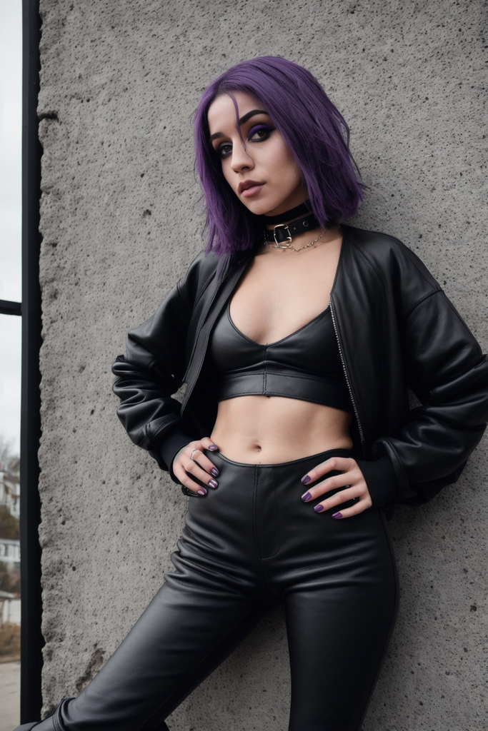 Shy goth girl with purple hair, leather choker, black crop top and black sweater pants, big leather boots with nails