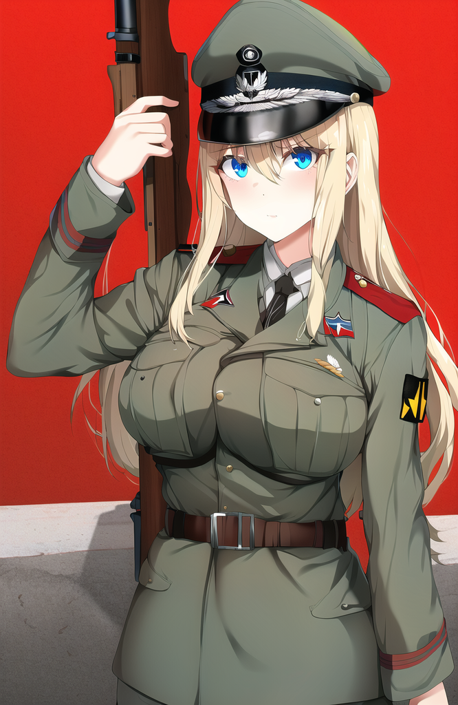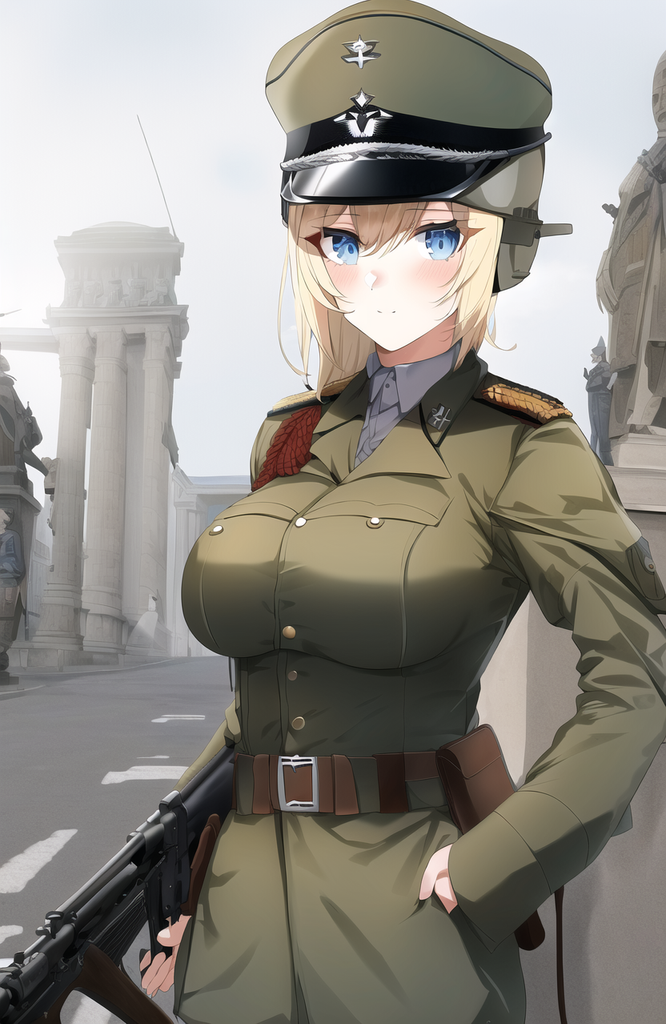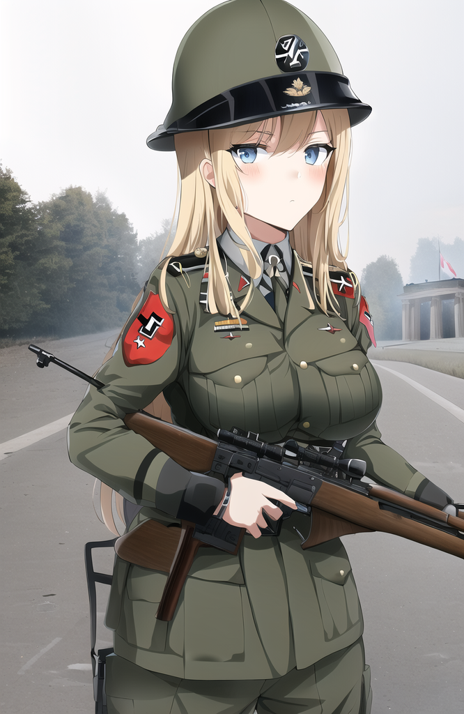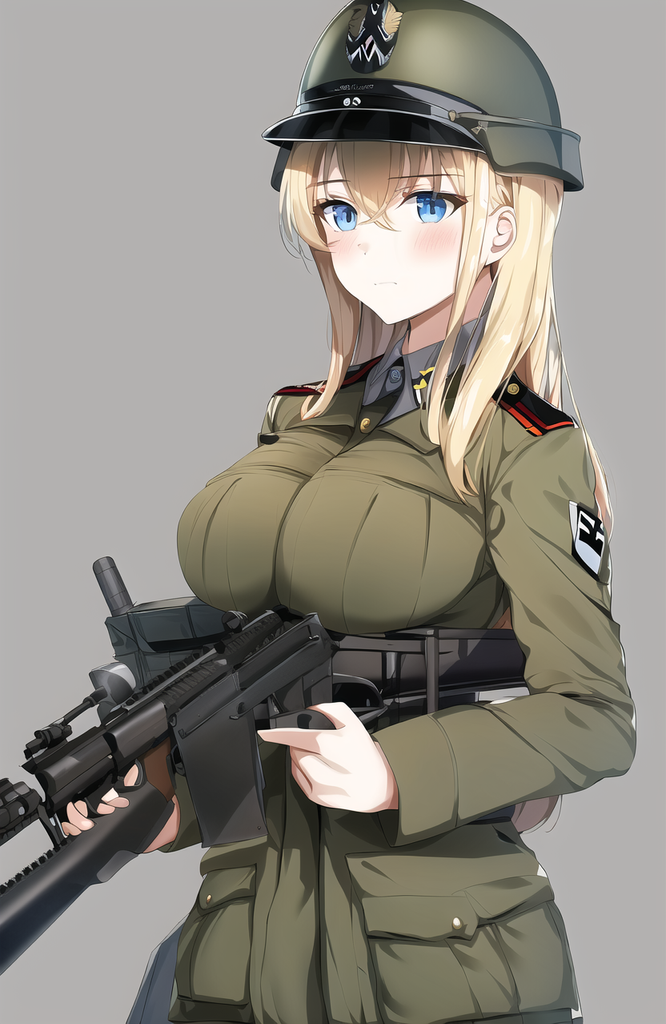 Blonde, seins moyens, yeux bleues, uniforme de la Wehrmacht, Stahlhelm, porte un Sturmgewehr 44 sur l'épaule