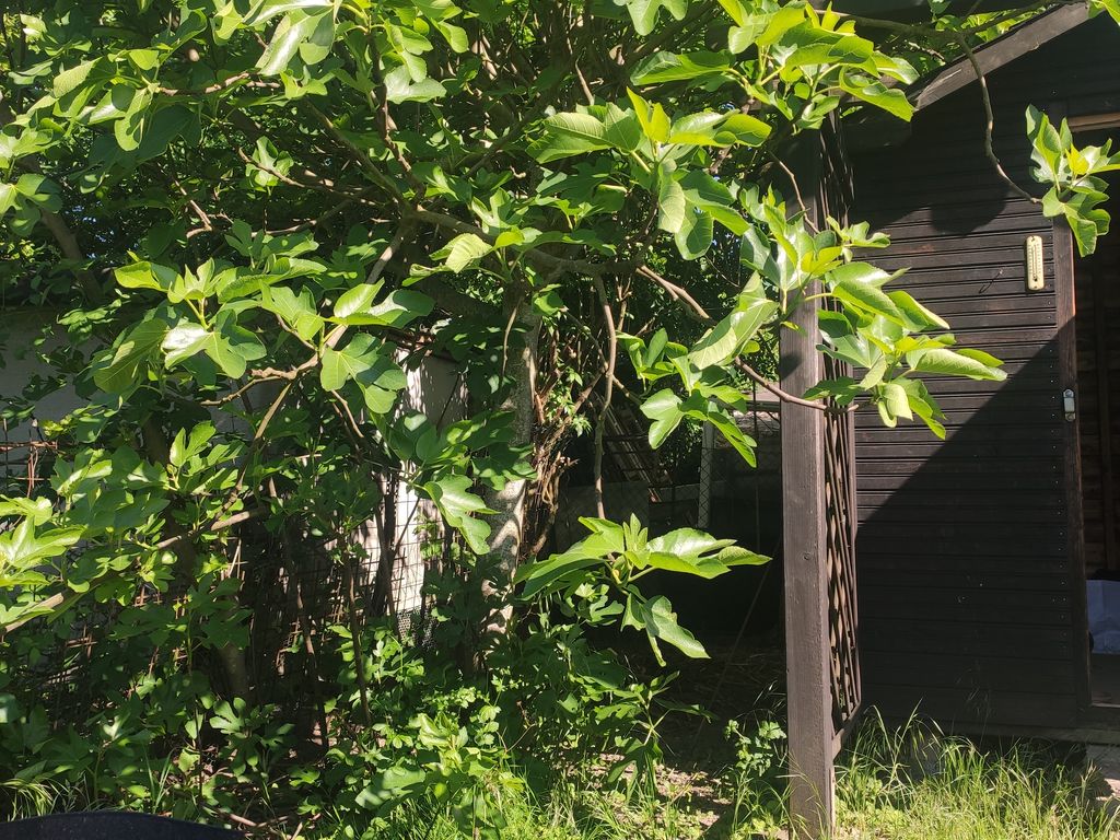 Là, nous avons un figuier qu'il va falloir continuer à surveiller. J'ai déjà coupé les branches qui touchaient le toit de la cabane, mais il faudra refaire une coupe à l'automne (après avoir récolté les figues, évidemment !)