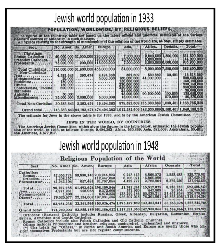 Ces chiffres sont ridicules pour plusieurs raisons dont la principale est que si ces chiffres sont vrais on doit admettre que la démographie juive a été très dynamique après 45 afin de rattraper leurs 15 millions pour finir par stagner jusqu'à aujourd'hui