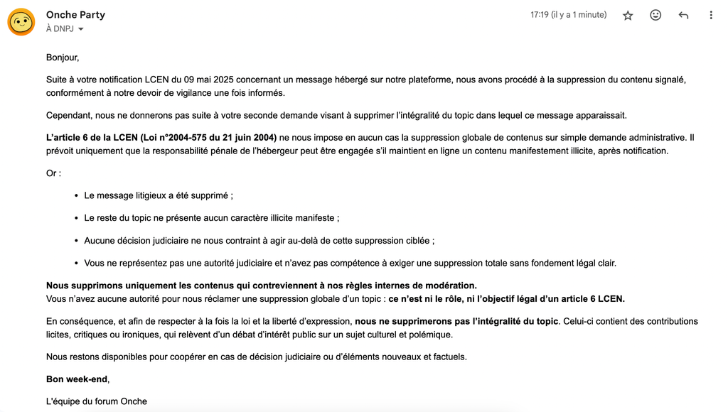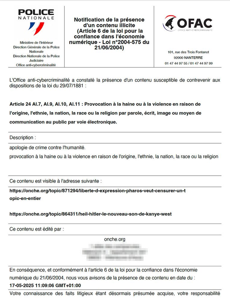 Petit rappel : un article 6, ça signifie que la police nous informe qu’un contenu potentiellement illégal est hébergé. À partir de ce moment-là, on est censé avoir “connaissance” du contenu, et donc juridiquement responsables s’il reste en ligne.