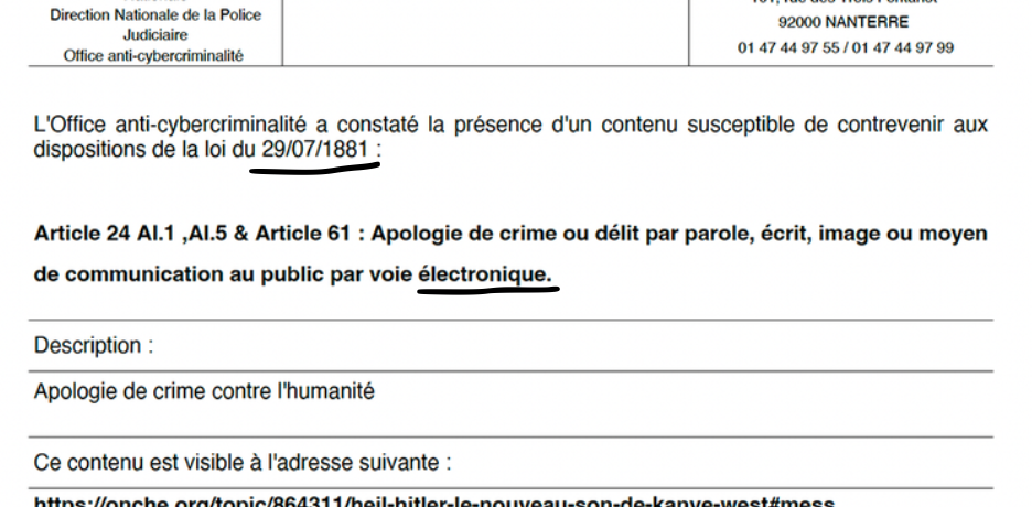 Hier, on reçoit un mail de Pharos : une notification Article 6 pour un message prétendument litigieux posté sur le topic « heil hitler le nouveau son de Kanye West »