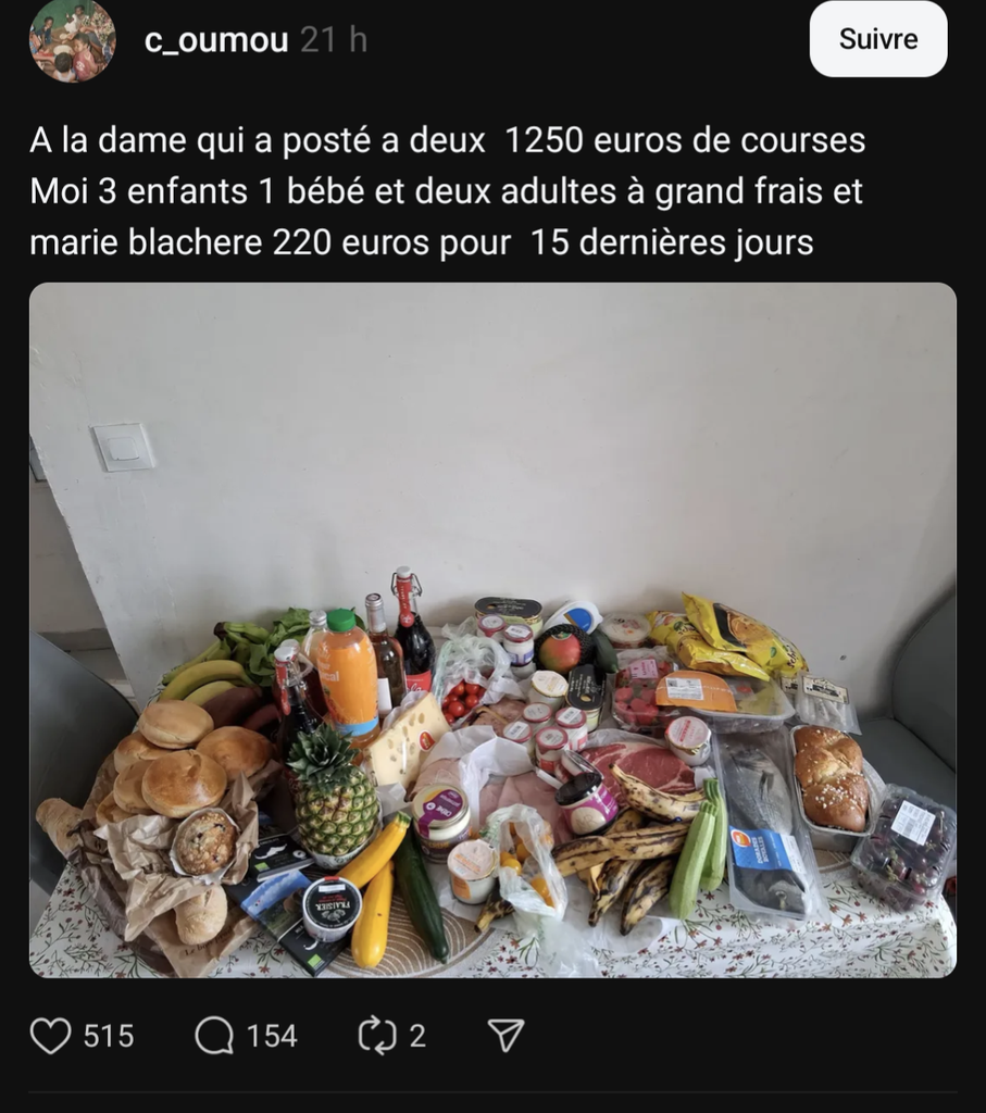 Je m'en sors pour 150 euros par semaine avec (Poulet - Poisson - Canard - Viande rouge (mais peu pour certaines raisons)) et tout ce qui est légumes produits ménagers etc...
