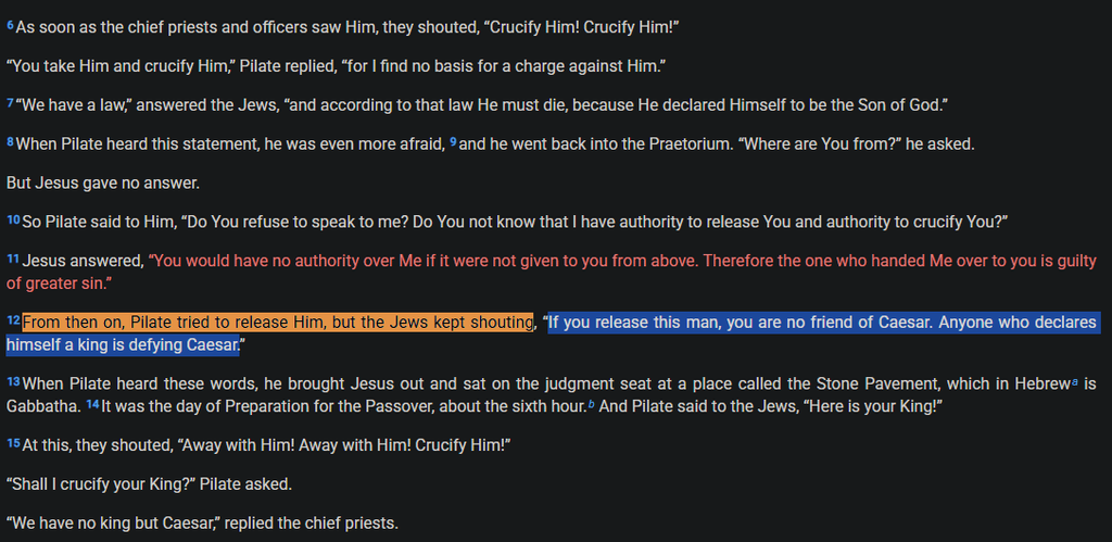 Si Pilate a fait tuer Jésus pour ne pas être tué par César, dans ce cas-là César est aussi en grande partie responsable de l'exécution de Jésus.