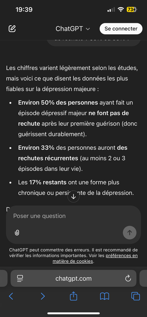 Pourtant même CHATGPT me donne raison, 50% des gens qui ont vécu une dépression s’en sortent et ne rechutent pas, j’ai donc fais partie de ces 50% ..