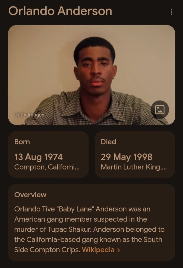 (Le soir de sa mort après le combat de boxe à Las Vegas il tabasse avec ses gardes du corps un certain Orlando Anderson qui faisait partie des Crisps).