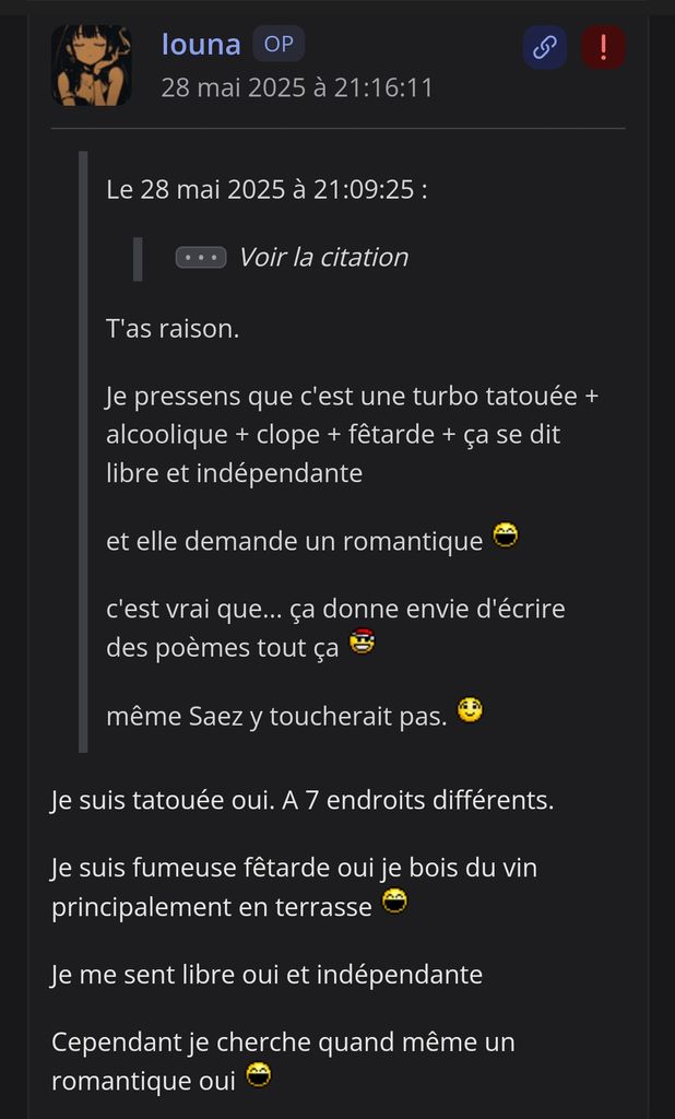 Bien sur on notera sur ce topic la présence du niveau 90 Lydens qui pop sur tous les topics pour dire qu'il a une copine nofake, comme si c'était un truc de dingue du 15 18 il y a 10 ans
