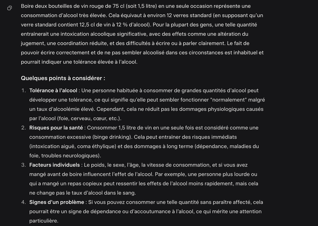 Bon, je viens de finir de boire deux bouteilles de vin rouge, j'ai une légère somnolence mais sans plus, des questions ?