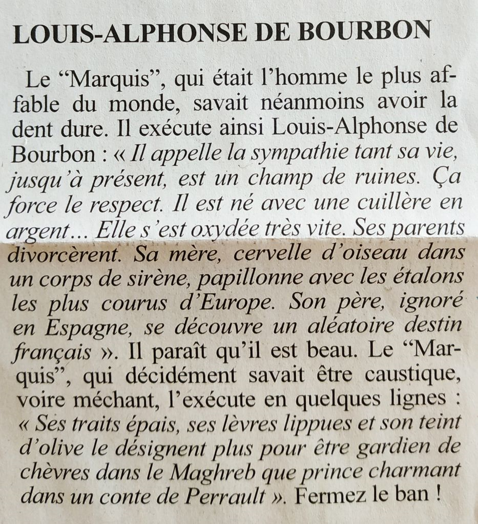 "Il est âgé de 51 ans, vit à Madrid mais possède la double nationalité française et espagnole. Le Prince Louis de Bourbon se présente aujourd'hui comme l'aîné des Capétiens en tant que descendant direct d'Hugues Capet, de saint Louis, d'Henri IV et de Louis XIV, et prétend au trône en tant que successeur légitime des rois de France.