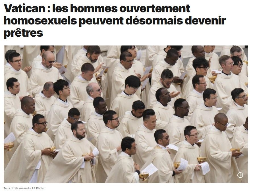 La Vatican se dit bien catho, ça ne l'empêche pas de donner la bénédiction aux couples pd ainsi qu'aux prêtes pd... demain le Vatican dira que les personnes en suicide assisté auront la bénédiction aussi, puis le surlendemain que les pédos auront la bénédiction aussi puisque l'âge légal aura changer comme la définition naturel d'un couple, et que finalement chacun est libre de "sa recherche de Dieu".