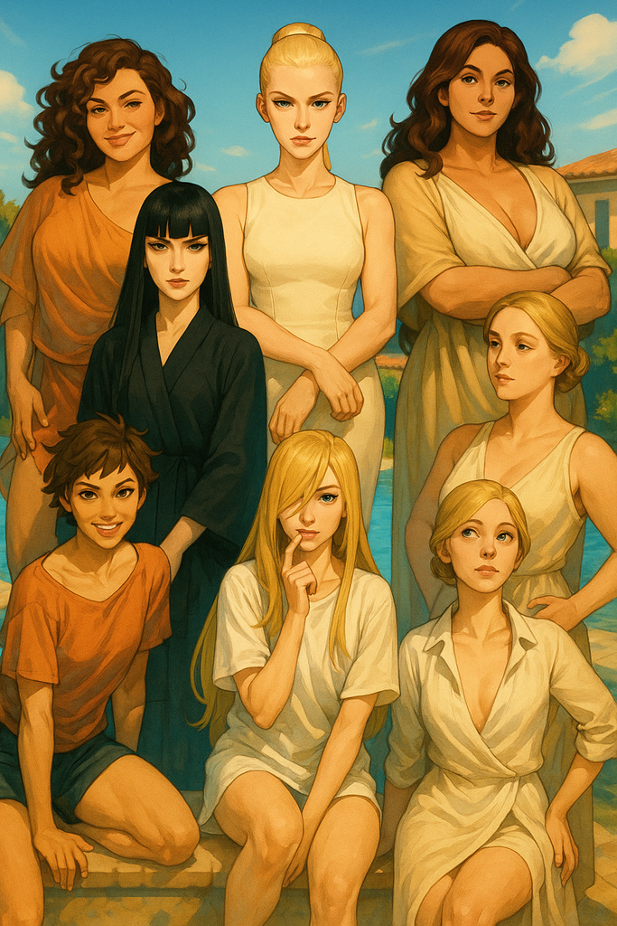 Les femmes, elles, sont pulpeuses, sensuelles, décomplexées, et aiment se montrer. Elles bronzent nues autour de la piscine, se déplacent dans la maison avec lenteur, se touchent parfois entre elles, ou se caressent nonchalamment — toujours en se sachant regardées.