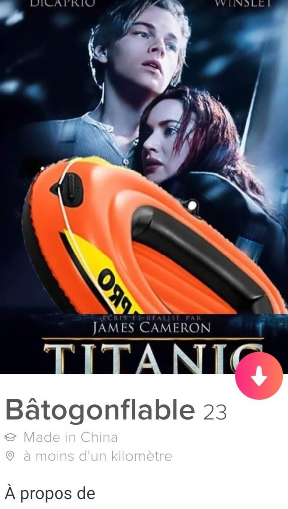 La prochaine fois que je date je dis que je m'identifie en tant que bateau gonflable et qu'elle doit vite me monter dedans ou me dégonfler pour me ramener chez elle