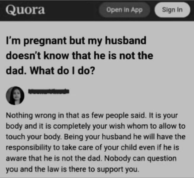 Incroyable d'écrire si tranquillement que l'homme trompé doit fermer sa gueule et élever l'enfant qui n'est pas de lui comme si de rien n'était