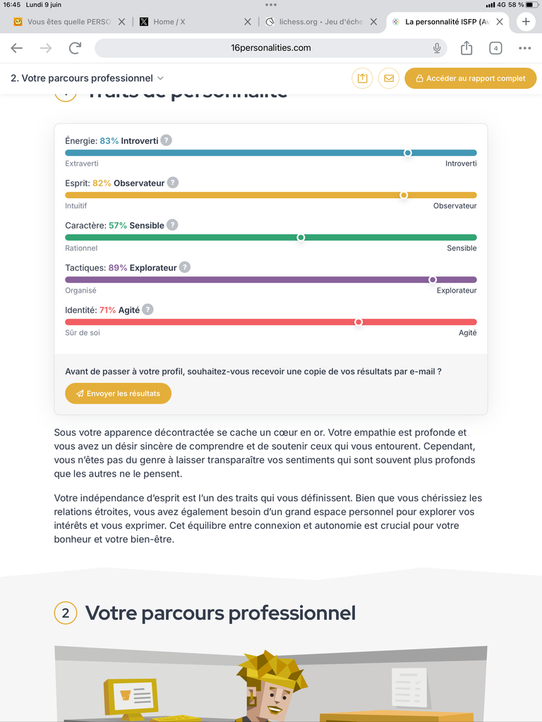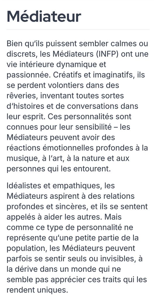 Si tu veux une alternative plus rigoureuse, je te recommande le test Big Five (OCEAN), basé sur 5 grands traits de personnalité, validé scientifiquement et bien plus précis.