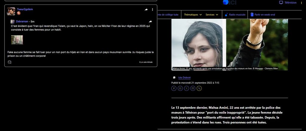 C'est évident que l'Iran qui revendique l'islam, ça vaut le Japon, hein, on va féliciter l'Iran de leur régime en 2025 qui consiste à tuer des femmes pour un habit.
