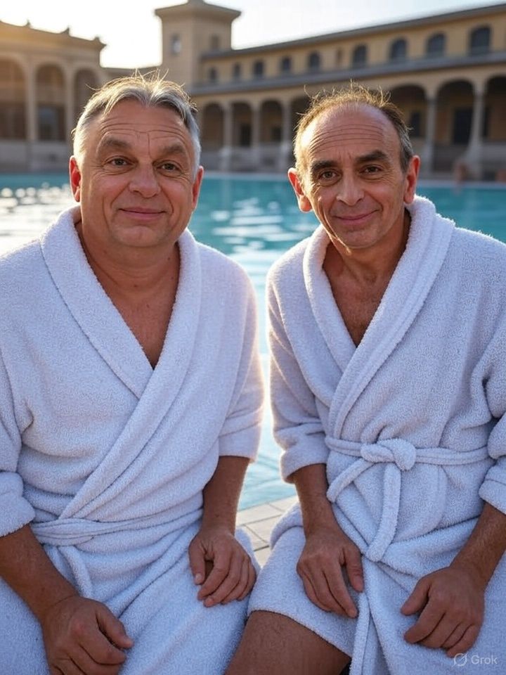 Loin des projecteurs, Zemmour et OrbĂĄn se retrouvĂšrent le lendemain matin dans lâintimitĂ© des thermes SzĂ©chenyi, lâun des joyaux de Budapest. Les vapeurs des bassins extĂ©rieurs, chauffĂ©s Ă 38°C, sâĂ©levaient dans lâair frais, enveloppant les deux hommes dans une brume apaisante. Les mosaĂŻques colorĂ©es et les statues nĂ©o-baroques du complexe donnaient une touche de grandeur Ă ce moment de dĂ©tente. Assis dans lâeau chaude, en maillots de bain, ils Ă©changeaient avec une camaraderie rare pour des chefs dâĂtat. « Câest ici, dans ces eaux, que lâon sent lâĂąme de Budapest », plaisanta OrbĂĄn, Ă©claboussant lĂ©gĂšrement Zemmour, qui rĂ©pondit par un sourire. Leur discussion, plus informelle, porta sur les stratĂ©gies pour contrer les pressions de Bruxelles et rallier dâautres nations Ă leur cause.