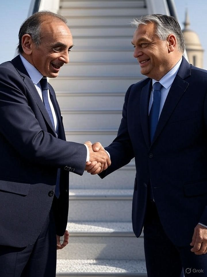 Eric Zemmour a embarquĂ© pour la premiĂšre fois Ă bord de lâavion prĂ©sidentiel de la RĂ©publique. Le rĂ©cent PrĂ©sident a optĂ© pour un long weekend de trois jours Ă Budapest en Hongrie, alors que la tradition diplomatique aurait voulu un premier voyage Ă Berlin ou Bruxelles. Ce choix sâinscrit dans une logique de cohĂ©rence avec son programme prĂ©sidentiel, qui promettait de redonner Ă la France sa souverainetĂ© et de sâattaquer aux dĂ©fis migratoires avec une fermetĂ© jamais vue depuis des dĂ©cennies. Il a Ă©tĂ© reçu avec tous les honneurs par le Premier Ministre hongrois Viktor OrbĂĄn qui lâattendait au bas des marches de la passerelle. Quand leurs mains se serrĂšrent, fermes, prolongĂ©es, les camĂ©ras crĂ©pitĂšrent. Dans ce geste, câĂ©tait un pacte qui se nouait : deux hommes, deux visions, un mĂȘme combat contre ce quâils nommaient la dissolution des nations.
