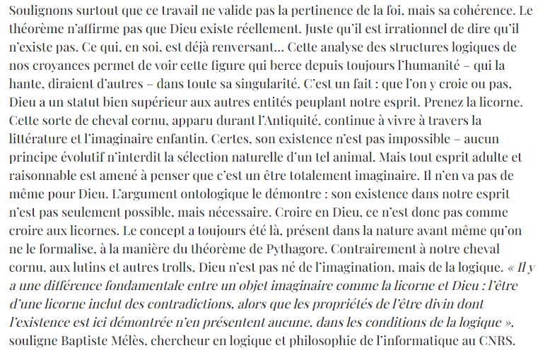 Contrairement à notre cheval cornu, aux lutins et autres trolls, Dieu n’est pas né de l’imagination, mais de la logique. « Il y a une différence fondamentale entre un objet imaginaire comme la licorne et Dieu : l’être d’une licorne inclut des contradictions, alors que les propriétés de l’être divin dont l’existence est ici démontrée n’en présentent aucune, dans les conditions de la logique »,