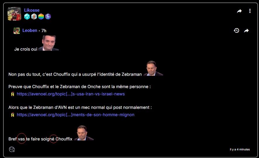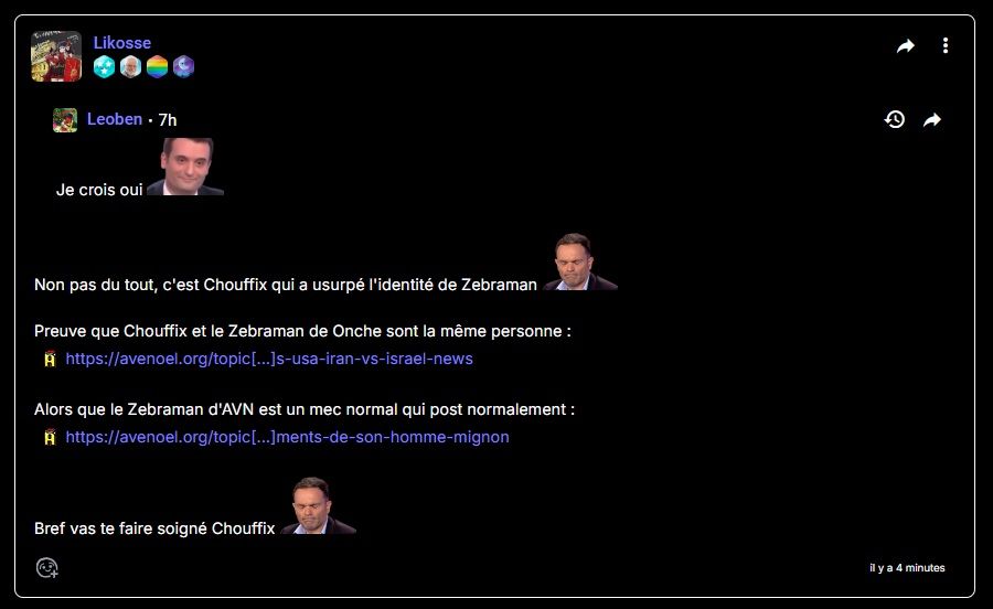 Ce serait bien de préciser qu'il s'inspire de mes topics et qu'il est très actif sur celui du débat de ce siècle. Et sinon, ce n'est pas le Zebra d'avn, il me l'avait dit. Vous vous souvenez aussi de quand il faisait ses interventions par rapport au forum avn, j'ai déjà échangé avec lui et je n'ai pas été sur avn pour ma part. Il est aussi des fois sur mon topic parlant de Mélenchon.