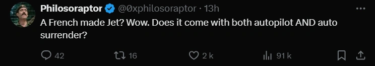 de même que là c'est pire, les français se ventaient que le rafale EST LE MEILLEUR avion au monde, tout ça pout lamentablement échouer, en se faisant abattre de loin et sur son propre territoire
