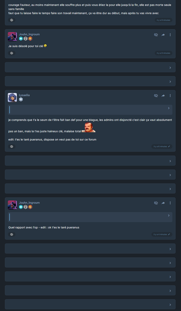 je comprends que t'a le seum de t'être fait ban def pour une blague, les admins ont disjoncté c'est clair ça vaut absolument pas un ban, mais la t'es juste haineux clé, malaise total