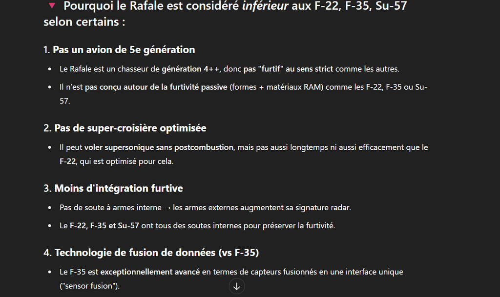 écoute tu utilises chat GPT, j'attends des sources crédible en attendant arrête de te ridiculiser en citant de l'aviation des années 90 et 70, en parle en 2025 le golem de mauvaise foi et en big 2025 la france s'est fait abattre son rafale par un shithole où il n'y a pas l'eau courante partout