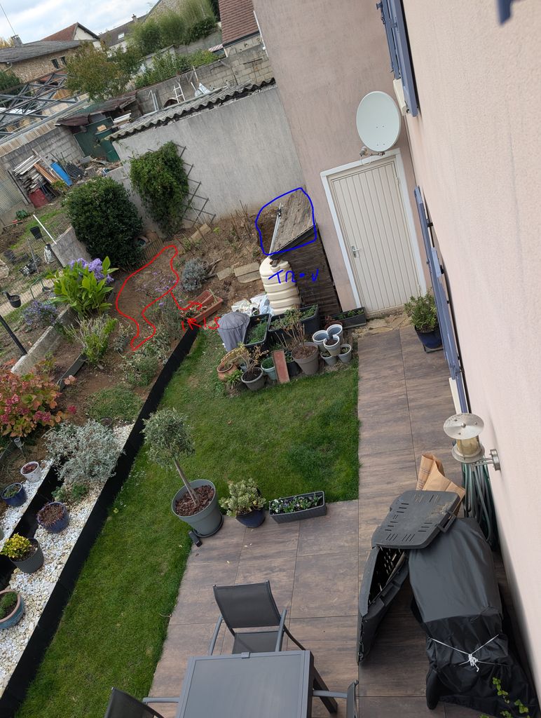 En bleu c'est le trou où il va y avoir l'abri de jardin qu'on voit pour gagner de la place (on va revoir enlever une partie en + a gauche avec mon beau père)