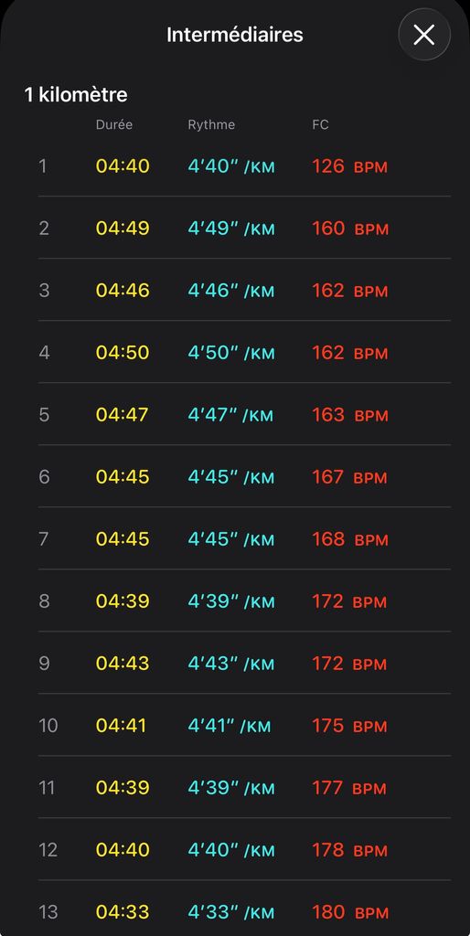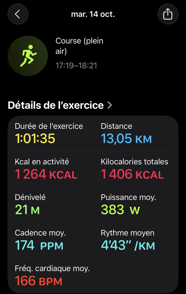 13km en 1h01'21" (je décompte les 14' des 50m de la fin