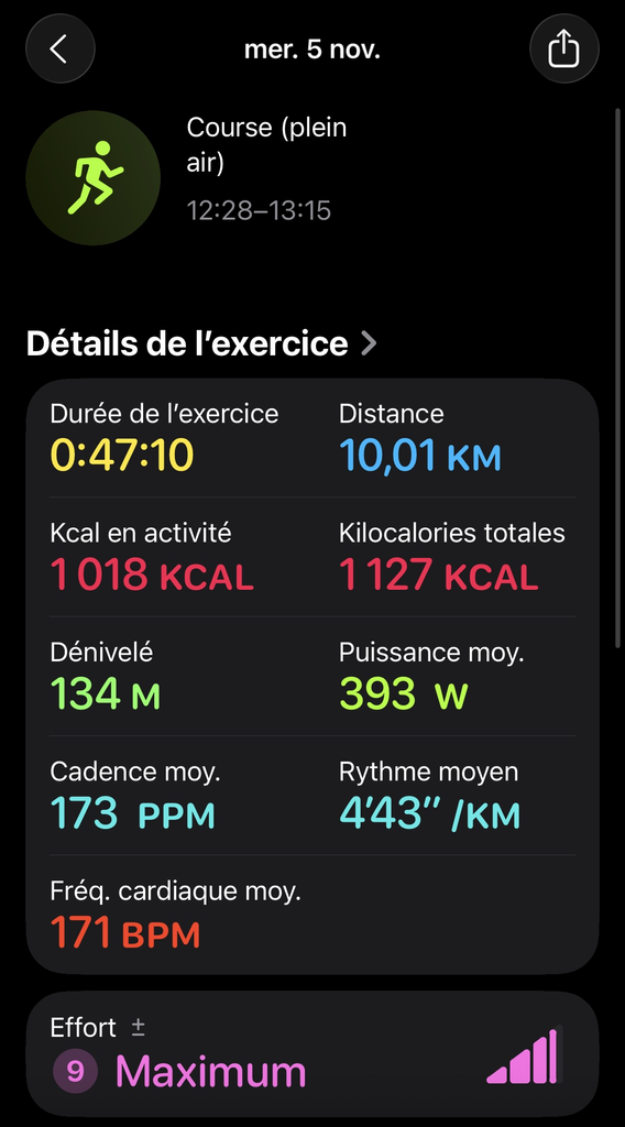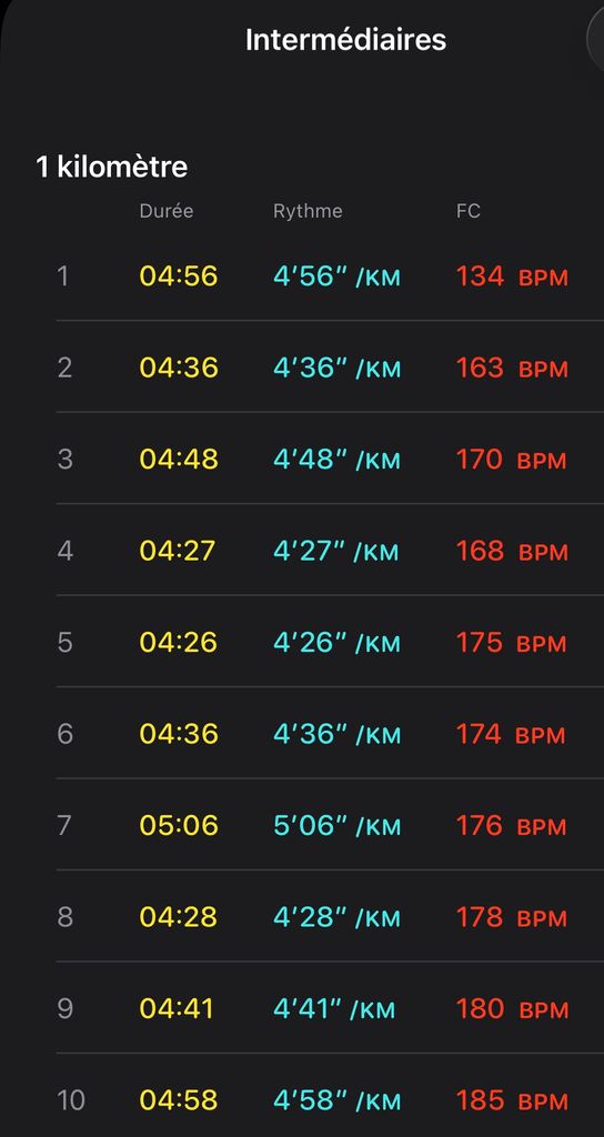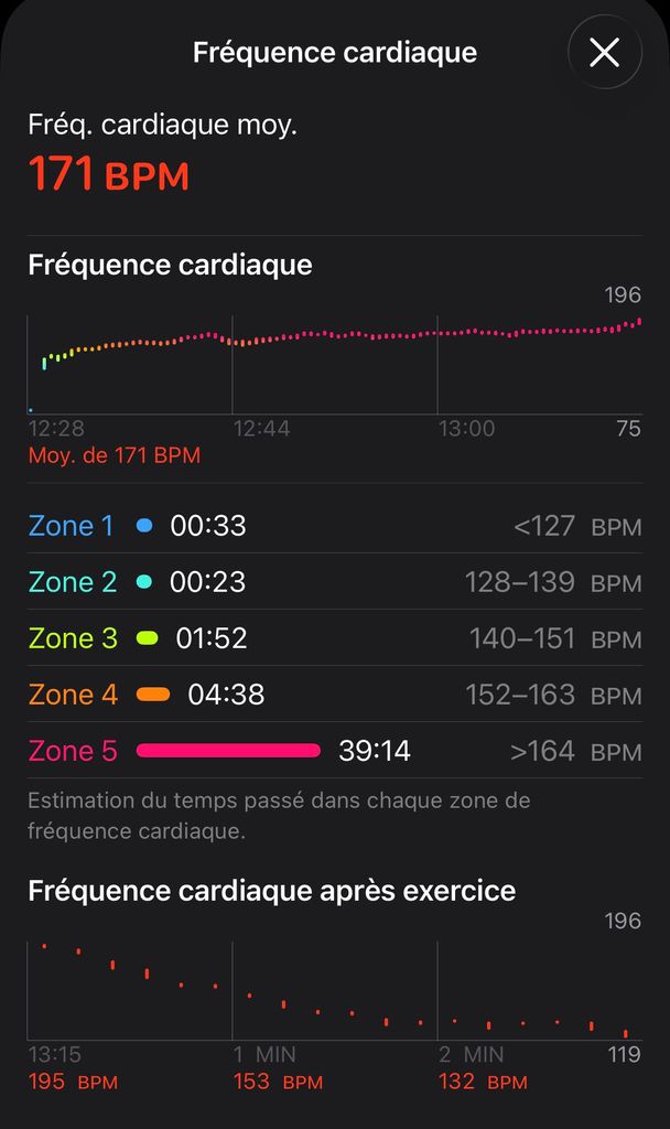 Tellement donné que ma montre a enregistré un rythme cardiaque max de 196BPM ce qui est normalement au dessus de mon maximum...