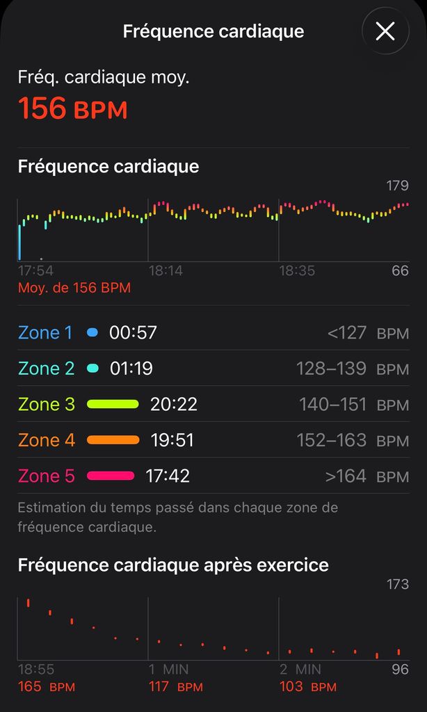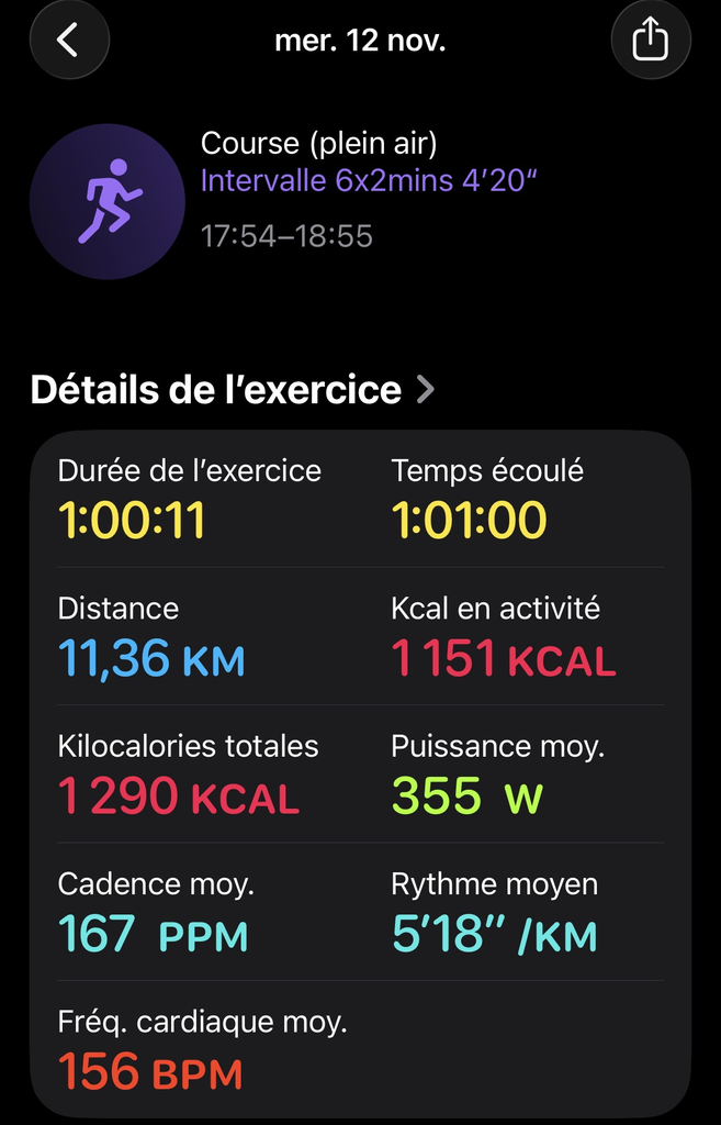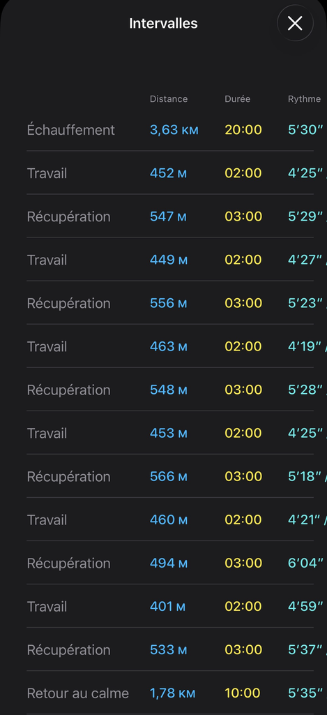 Pas facile de tenir le rythme précis, mais la montre aide pas mal. Les résultat est pas parfait, surtout pour le dernier intervalle, mais c'était dans une grosse côte, j'ai explosé