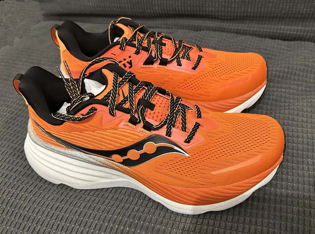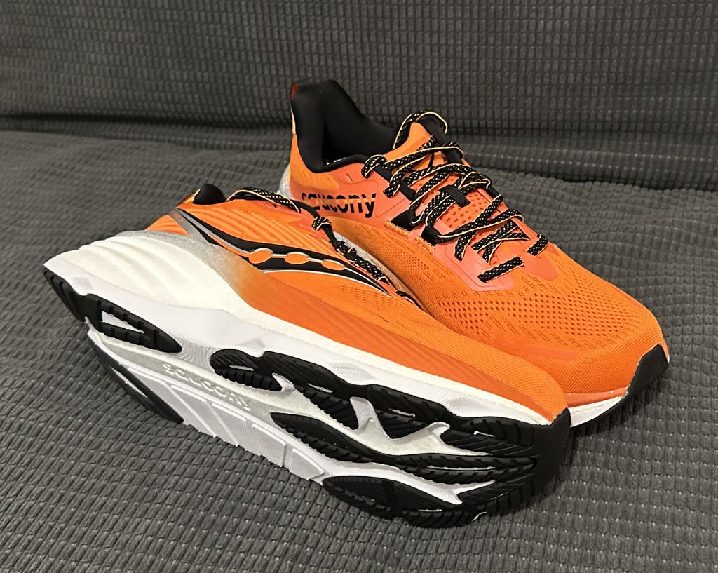 Deuxième paire : Saucony Hurricane 24, ce sera mes pompes pour l'entrainement de course, plutôt pour les sorties longues, c'est des chaussures avec un amorti et une stabilité au top, mais pas les plus réactives.