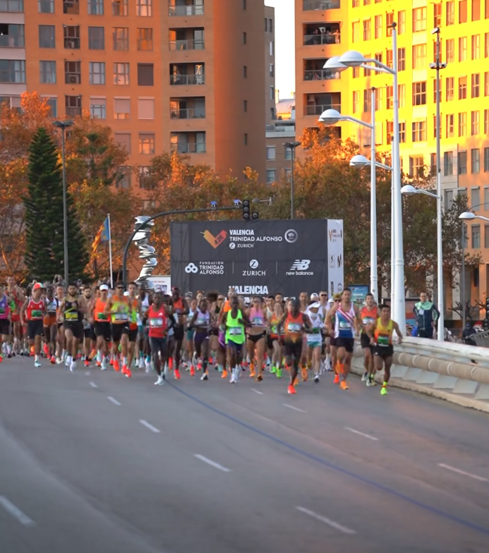 Regarde ici, c'est le départ du marathon de Valence qui a eu lieu il y a quelques jours, t'as vu le nombre de coureurs qui ont des chaussures rouge/orange fluo ?