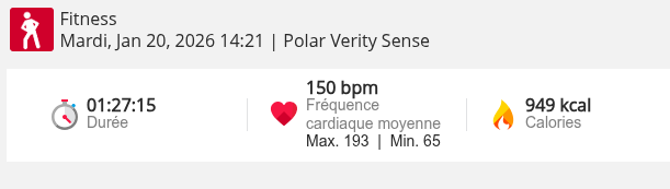 J'ai fait une grosse accélération sur la dexième partié difficile du vélo elliptique, du coup je suis remonté à ma FC max (193BPM) ça faisait longtemps que ça m'était plus arrivé, même en forcant comme un âne...