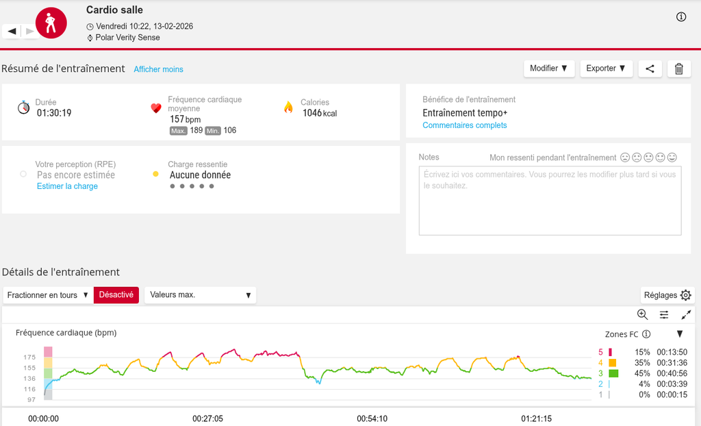 - 42 minutes vélo elliptique mode intervalle niveau 11 à 87RPM de moyenne