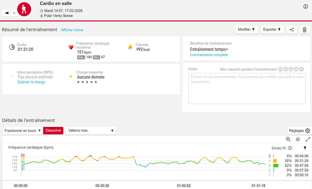 Je tombe a 151 BPM de moyenne niveau cardio, y'a clairement un gros gap aujourd'hui que ce soit au repos, ou durant cette séance, mon cardio retrouve des valeurs sympa, avec pour la première fois depuis bien longtemps (2 mois en réalité) une FC au repos mesurée au plus bas durant la journée à 49 BPM.