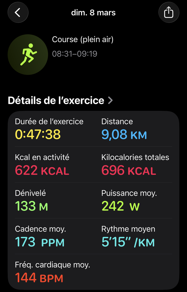Petit 9km tranquille, même si je trouvais que ça tirait un peu sur les jambes, sans doutes à cause du Crossfit d'hier soir