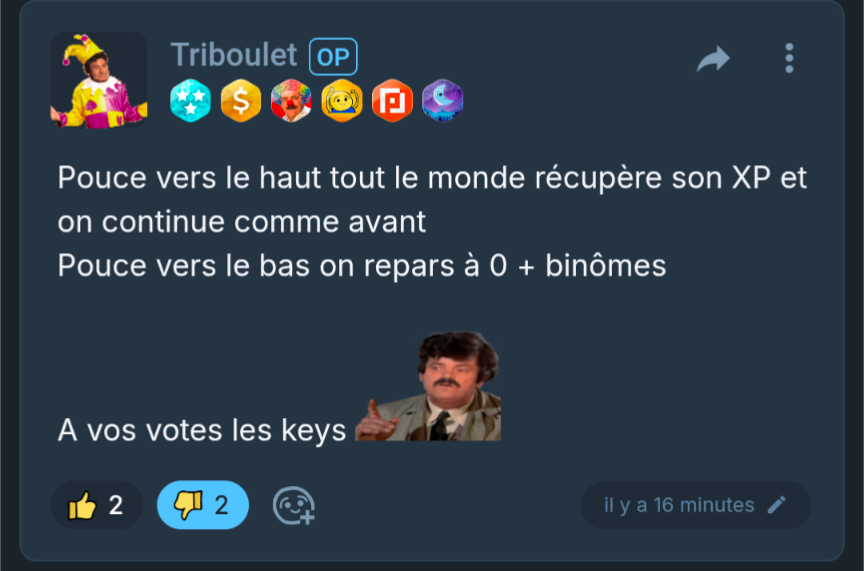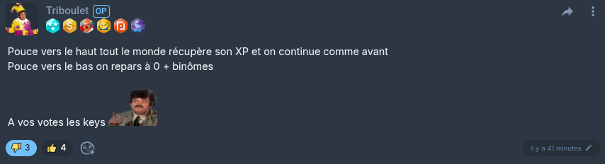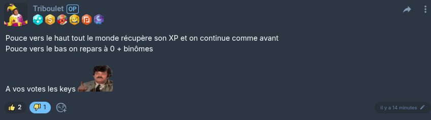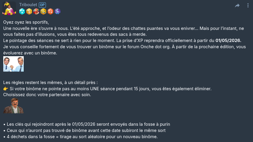 Si on reset à 0 on reprend les pointages le 01/05, le temps que tout le monde trouve son binome ou chauffe d'autres membres du forum.