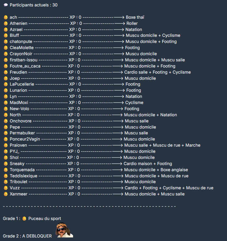 Grade 1 : 👶 Puceau du sport ------------------------> 0 XP