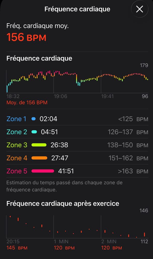 Si tu remonte à y'a 2 jours, mon jogging de dimanche je suis à 173 bpm de moyenne.
