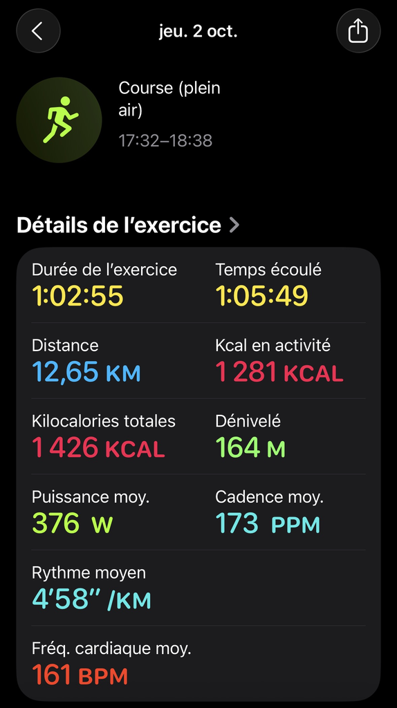 J'y suis allé cool, sans me mettre dans le rouge, 161 BPM de moyenne, c'est 12 de moins que dimanche dernier... pour 26" du km en plus... et 2,6km en plus... bref, y'a pas grand chose à en déduire, mais c'était plutôt agréable, premier entraînement où je me sens relax, même si j'ai un peu forcé plus sur la fin...