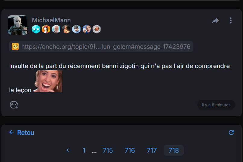 Imagine l'op recevoir des messages d'insulte comme guise d'introduction à un loustique déjà banni par le passé qu'il ne connaît pas