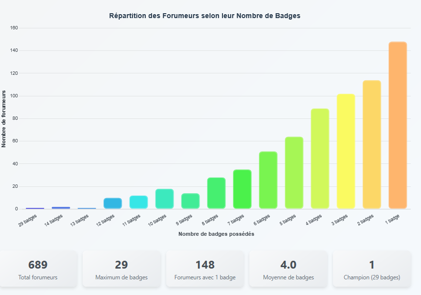 Après disparation des bronzes (et aussi des comptes sans aucun badge) du panel, on se retrouve toujours avec 689 forumeurs ayant totalisé 2761 badges, ce qui fait grimper la moyenne de badges par forumeurs à 4.00.