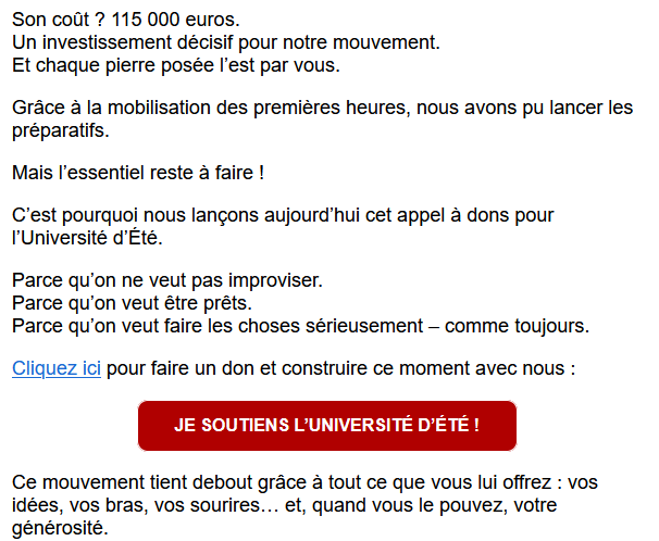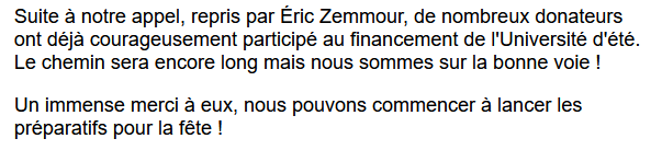 Juste, au passage, dans ce mail (le ENIME mail en quelques jours), un truc nouveau, eh eh eh... J'ai été dans d'autres partis, dont le RN, JAMAIS je n'ai vu un parti autant ramer pour organiser une université d'été (sur le plan financier) et attirer assez de monde là (pour rentrer dans leurs frais ! ).