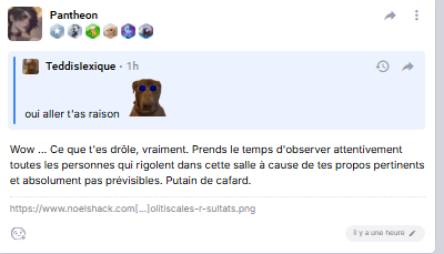 Une simple blague méritait un « putain de cafard » et un comportement aigri passif agressif, oui bien sûr la sous-race, bonne soirée