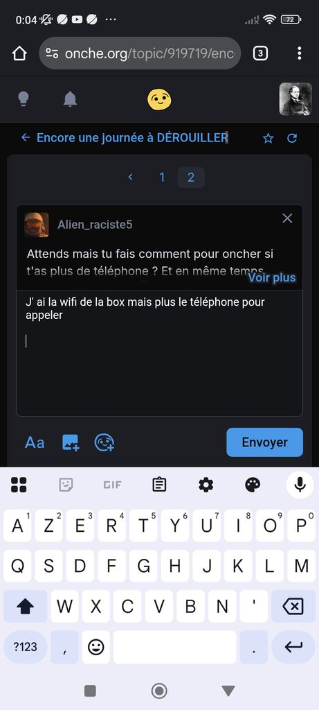 Non non j'ai plus de téléphone, j' ai essayé en mettant ma carte sim dans un autre téléphone c'est pareil il me reste que les chats et les voisins, ils fument sans arrêt au dessus de chez moi je peux les appeler