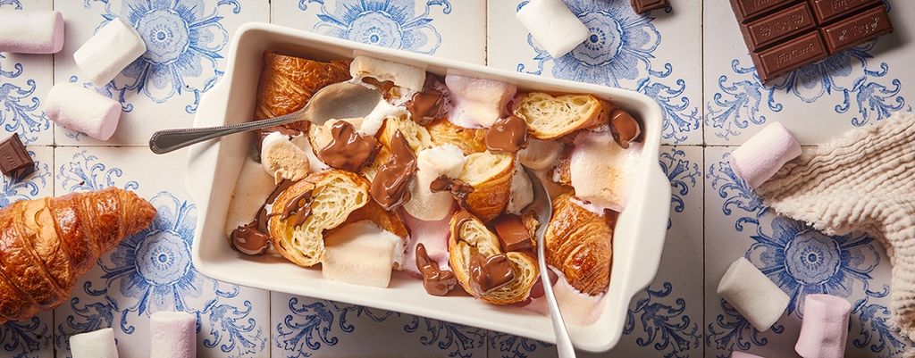 4. Disposer les croissants dans un plat à gratin puis concasser quelques carrés de chocolat.