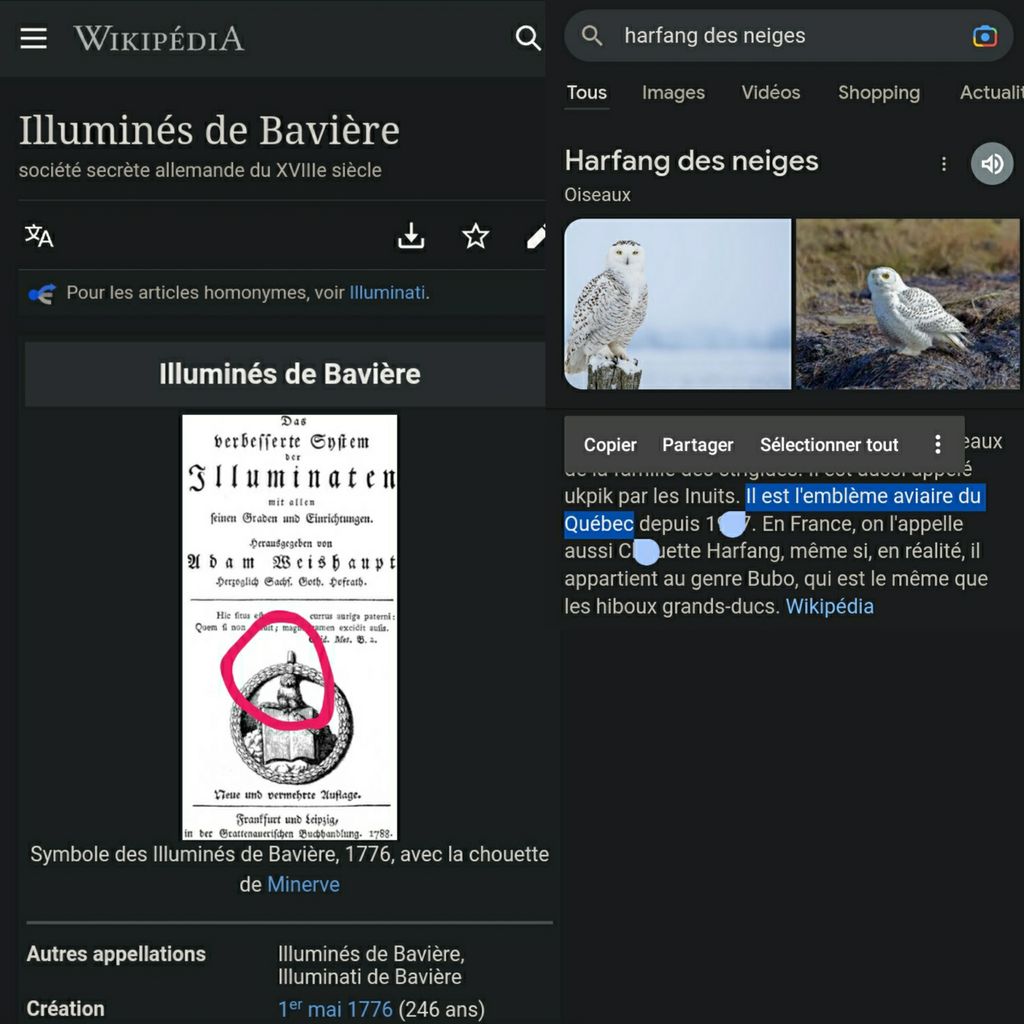 L'animal sur le premier symbole des illuminati, de leur vrai nom "illuminé de Bavière" à comme symbole un Hibou et l'animal qui représente le Québec est justement un hibou. Par exemple la France c'est le Coq et les USA le piguare.