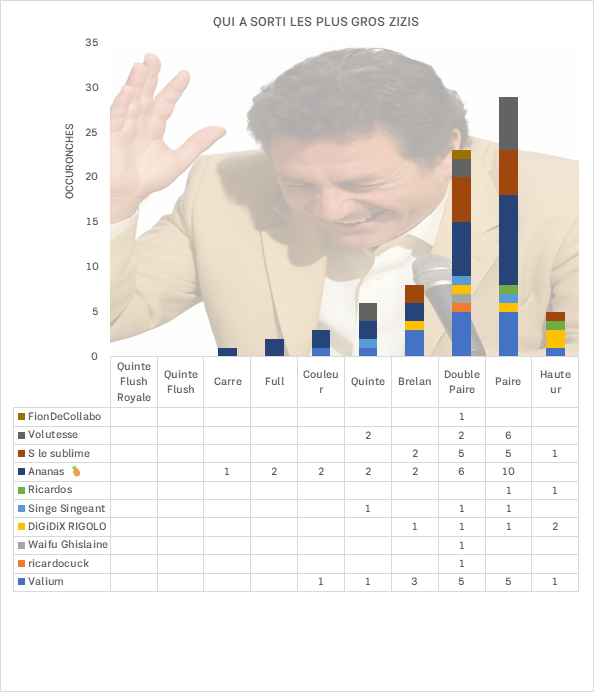 10ème : ricardocuck sodomisé par S le sublime avec Brelan de Valets Hauteur As contre Double Paire Valet et Quatre Hauteur Neuf à l'issue de la manche n°1