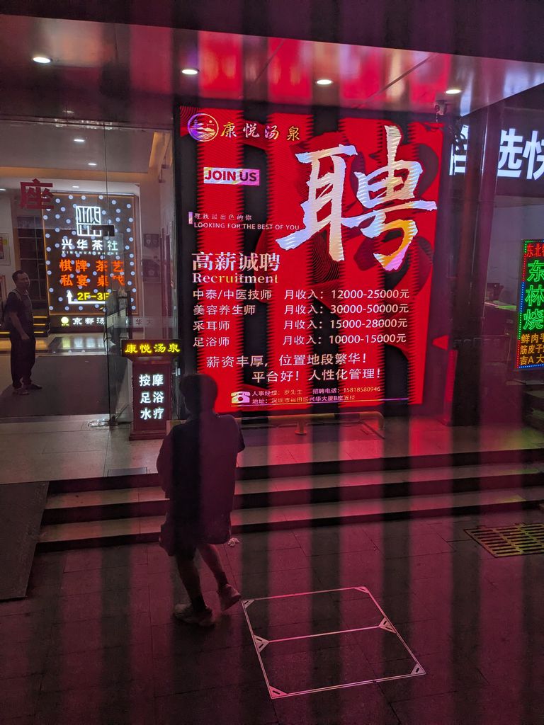 C'est une annonce pour un salon de massage/spa, ça va du masseur de pied à 10 000 rmb (1250 euros) au thérapeute beauté senior à 50 000 rmb (6250 euros) d'autres types de massages/soins entre les deux.