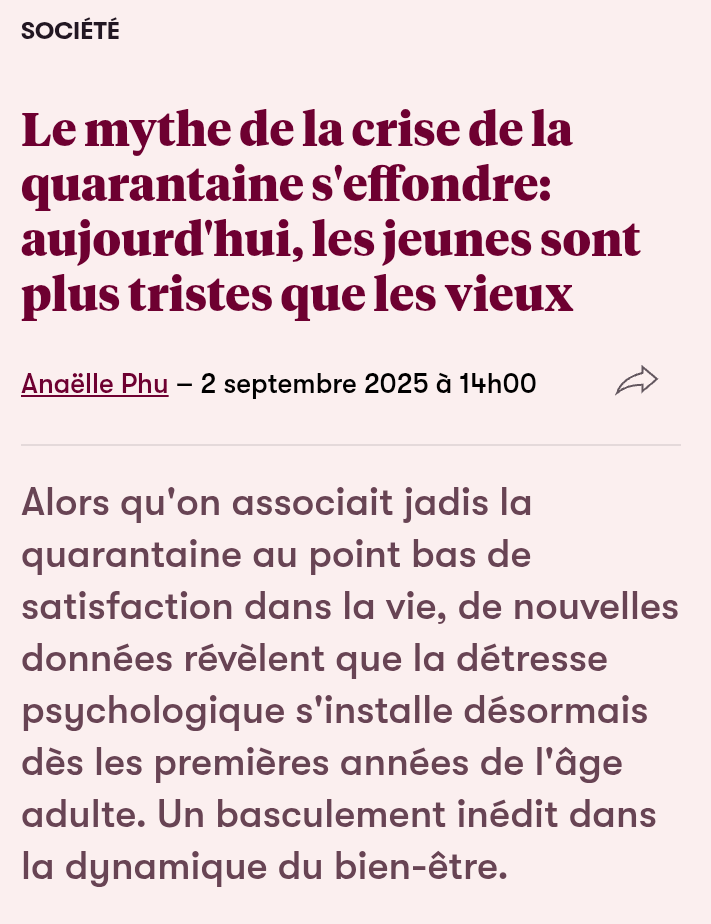 J'imagine aussi que le flux constant des écrans et des distractions joue aussi un rôle là-dedans, la chimie de notre cerveau doit etre complètement bousillée. Et puis, pas grand monde est capable de mettre des mots sur son mal, ça n'aide pas non plus à se tirer de sa détresse